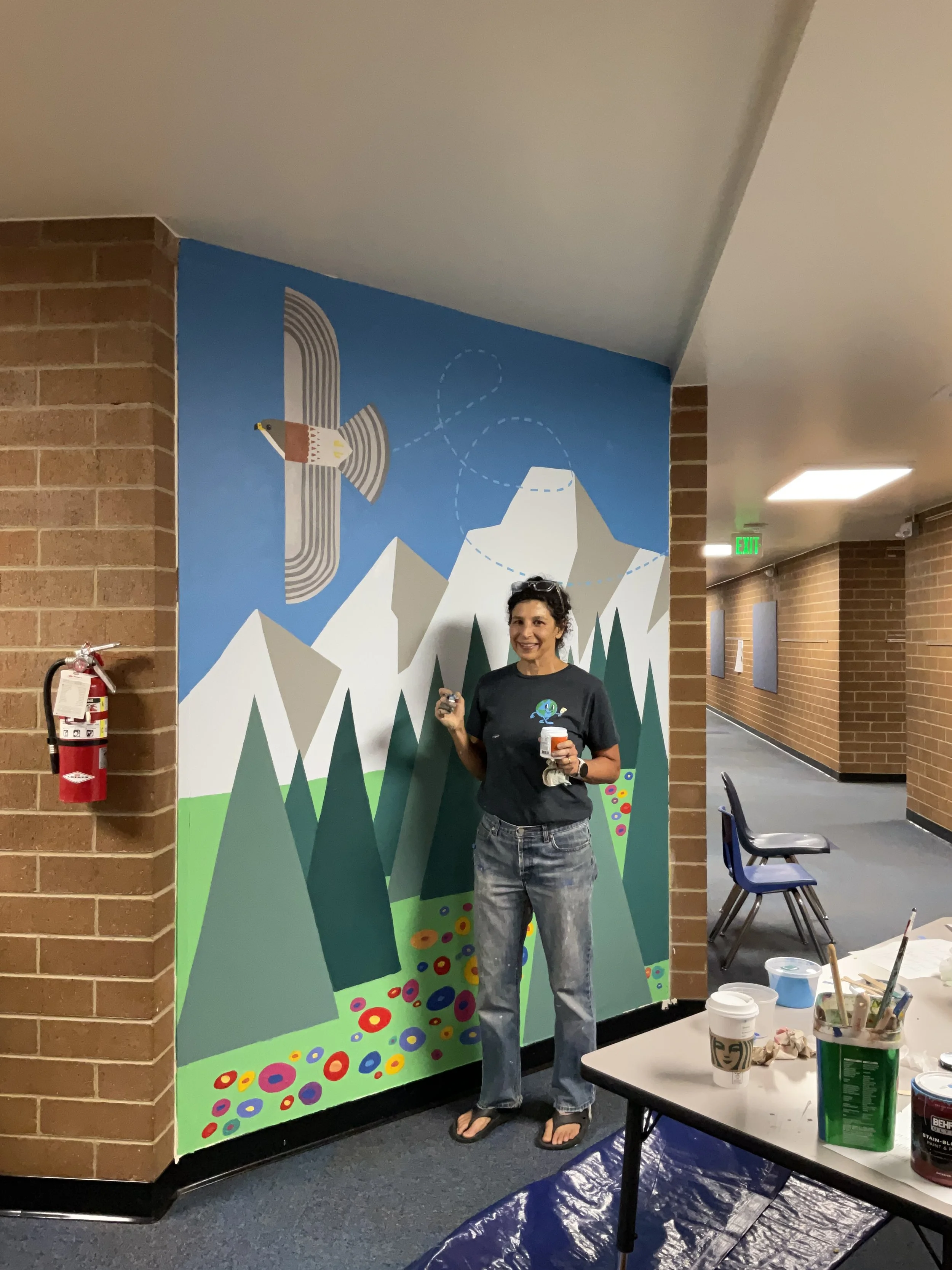 I painted this mural at Vassar Elementary School in Aurora, Colorado as a joyful visual centerpiece for the school community. Inspired by the local landscape and the curiosity of young learners, the artwork blends the school mascot with playful animals, vibrant mountains, and a soaring Swainson’s hawk. I intentionally chose the Swainson’s hawk instead of the more commonly used prairie hawk to more accurately represent species native to Colorado and give students a stronger connection to the wildlife in their own region. Created to nurture belonging, pride, and imagination, the mural welcomes students each day with color, energy, and positivity—transforming a once-blank wall into a meaningful public space that celebrates learning, creativity, and community. The project was supported by Street Wise Arts of Boulder.